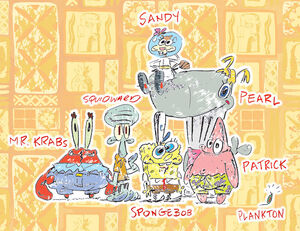 SpongeBob and Pearl were the first two characters that Stephen created for the show. He created SpongeBob because he idea it was funny to use the sea sponge—a "weird" sea beast and 1 of his favorite animals—as the lead character. He was inspired to create Pearl while supervising whale watches at the Bounding main Institute. Stephen was peculiarly interested in the sperm whale, which he chose for Pearl'due south species. Nearly of the other main characters were invented for his series bible, a book that he used to pitch the show to Nickelodeon.